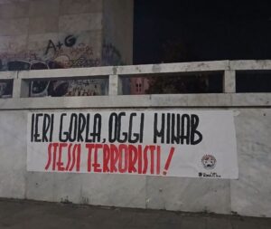 Centinaia di striscioni in tutta Italia per stigmatizzare l’ennesima guerra preventiva celata dai fantomatici bombardamenti democratici in realtà pura azione criminale, illegale e terroristica che ha nuovamente come obiettivo uno stato sovrano: l’Iran.